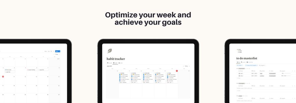 A weekly planner notion template complete with a weekly calendar view, a habit tracker and a task masterlist, also including a weekly reset. Stay organized, prioritize tasks, cultivate positive habits, reflect on your progress, declutter your thoughts, and prioritize self-care.
