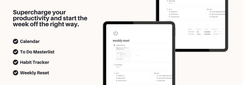 Take control of your week and optimize your productivity with our comprehensive Weekly Planner + Reset Notion Template.